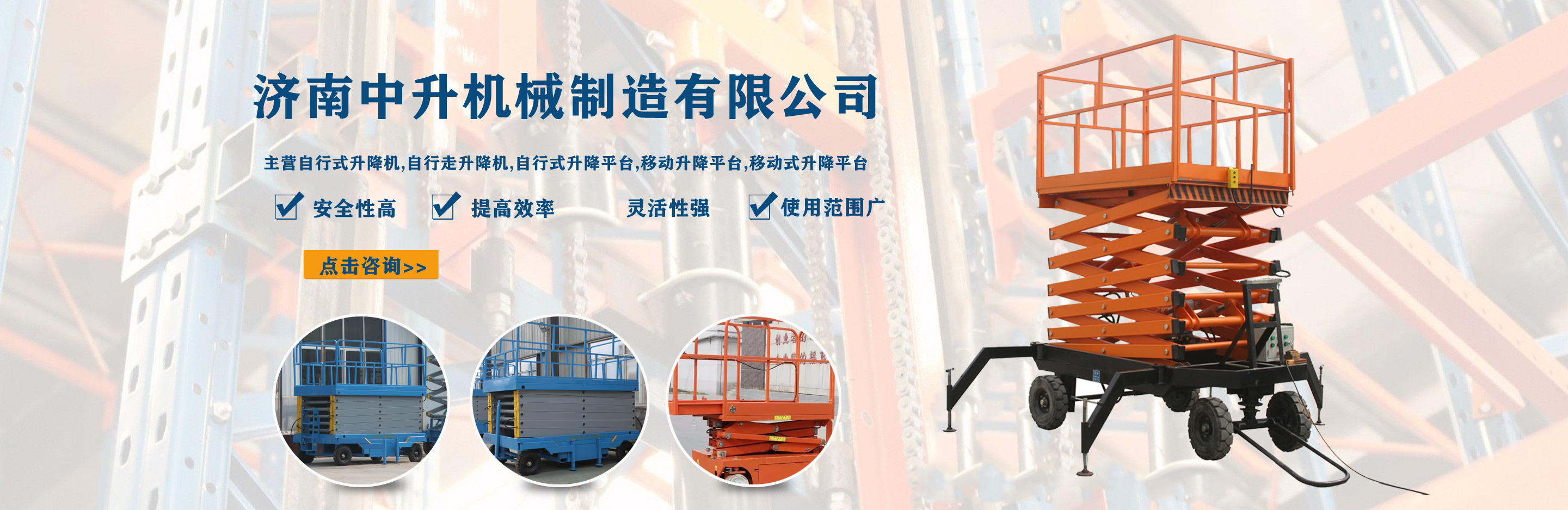 濟(jì)南中升機(jī)械制造有限公司主營自行式升降機(jī),自行走升降機(jī),自行式升降平臺,移動(dòng)升降平臺,移動(dòng)式升降平臺等產(chǎn)品,產(chǎn)品廣泛用于廠房維護(hù)、工業(yè)安裝、設(shè)備檢修、物業(yè)管理、倉庫、航空、機(jī)場、港口、車站、加油站、體育場、展覽館等多種行業(yè)和場所, 公司設(shè)備精良、工藝合理、檢測手段齊全,技術(shù)力量充足,公司創(chuàng)立伊始即本著“專注、專心”的經(jīng)營理念,依托技術(shù)團(tuán)隊(duì)優(yōu)勢和設(shè)備硬件保障,全力打造良心的升降平臺企業(yè)?! ∥夜臼冀K以“品質(zhì)為本,服務(wù)至上”作為企業(yè)宗旨。只要你訂購了我公司的產(chǎn)品,無論你身處何方,我們都會(huì)及時(shí)派出技術(shù)人員為你服務(wù)!...